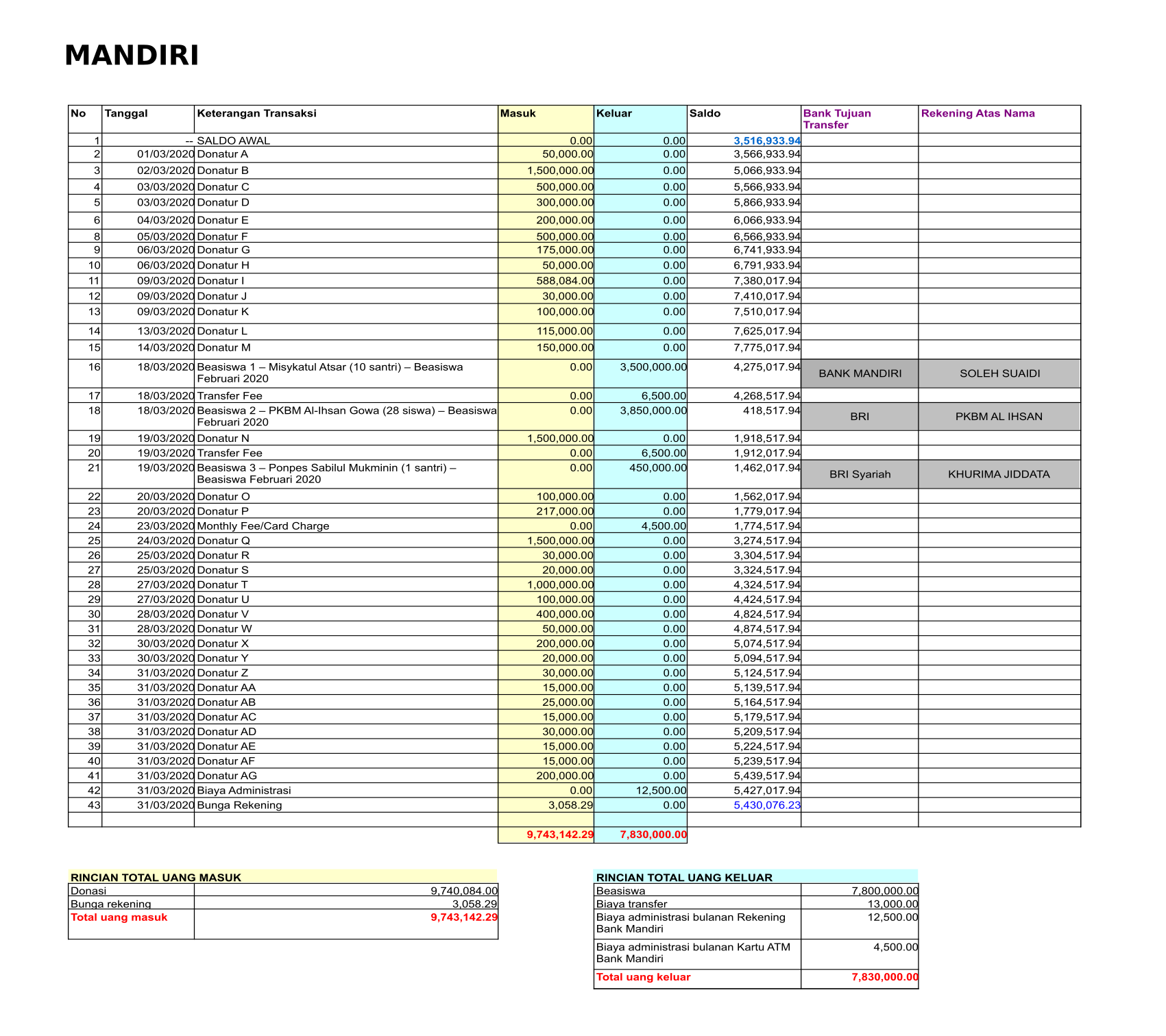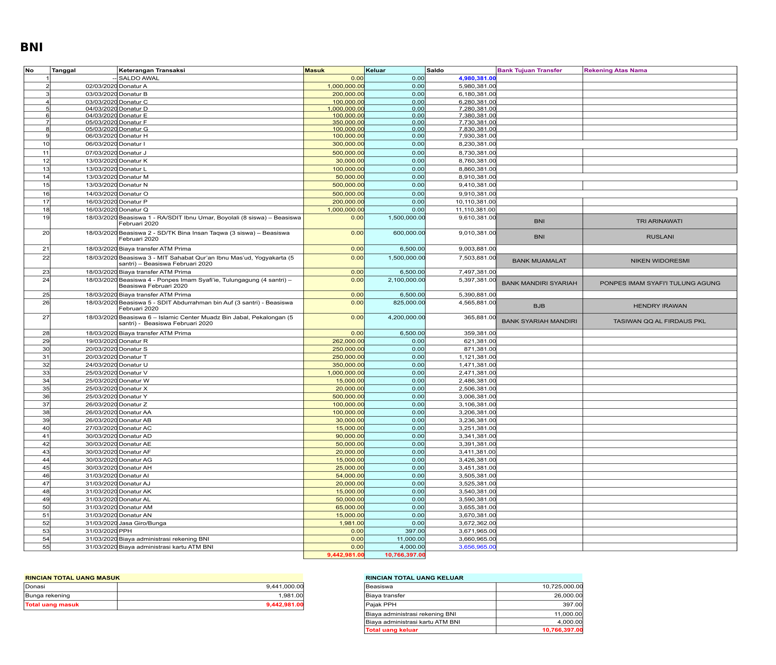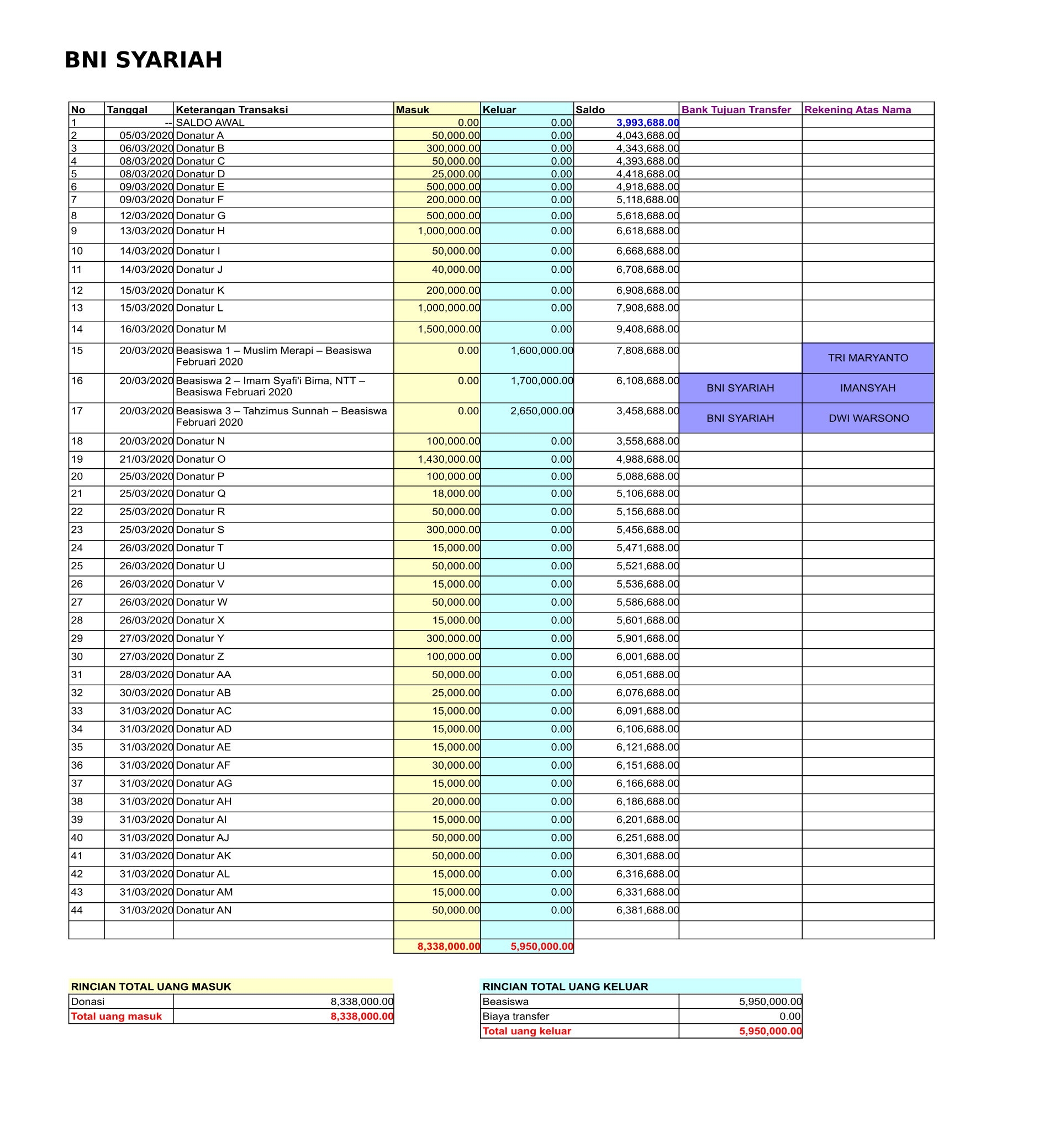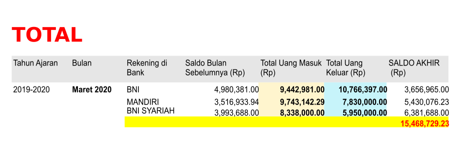 NERACA KEUANGAN KIA – MARET 2020NERACA KEUANGAN KIA – MARET 2020#1 SALDO TOTAL #2 [NERACA KEUANGAN] Rekening BNI #3 [NERACA KEUANGAN] Rekening MANDIRI #4 [NERACA KEUANGAN] Rekening BNI SYARIAH