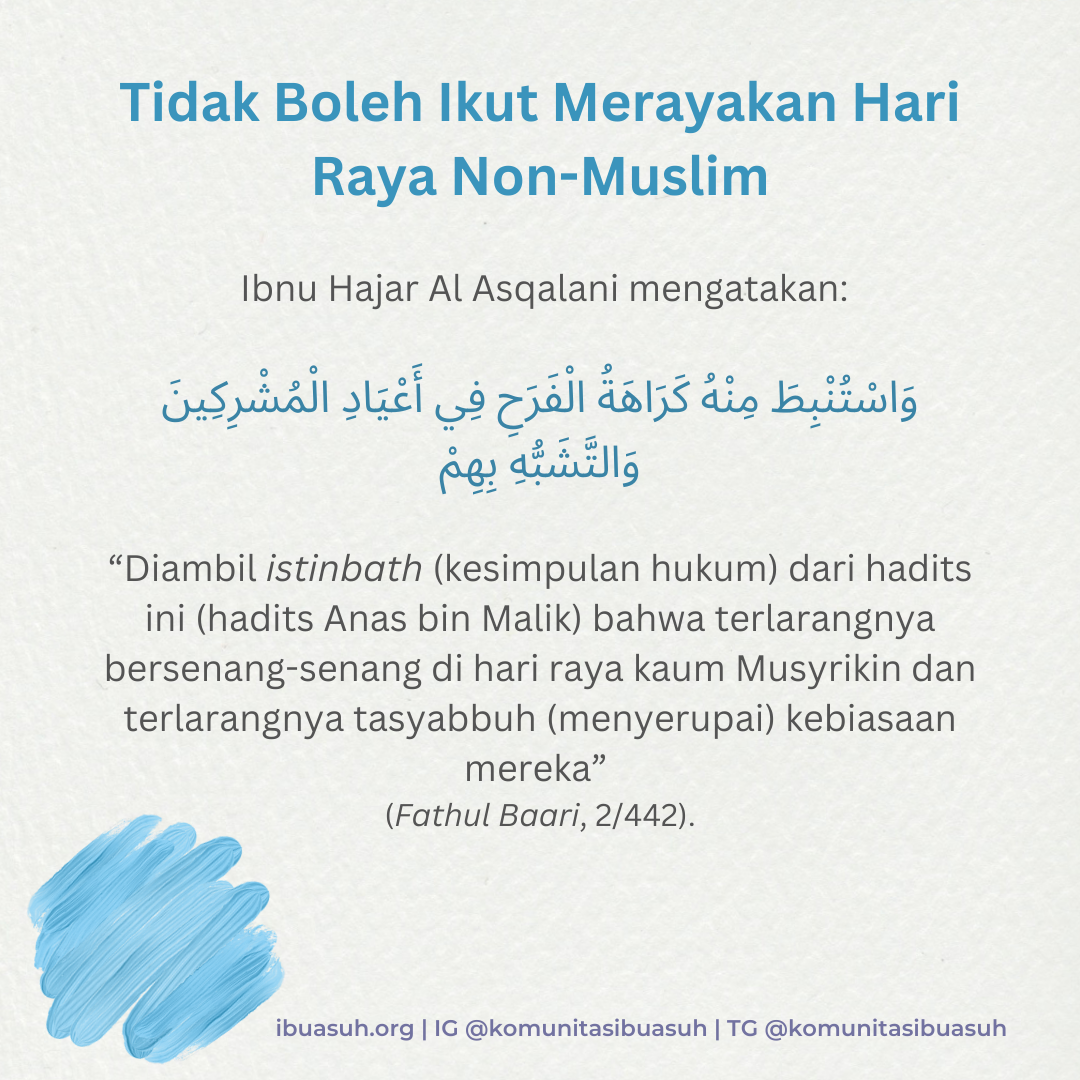 Ibnu Hajar menjelaskan: “Diambil istinbath (kesimpulan hukum) dari hadits ini bahwa terlarangnya bersenang-senang di hari raya kaum Musyrikin dan terlarangnya…